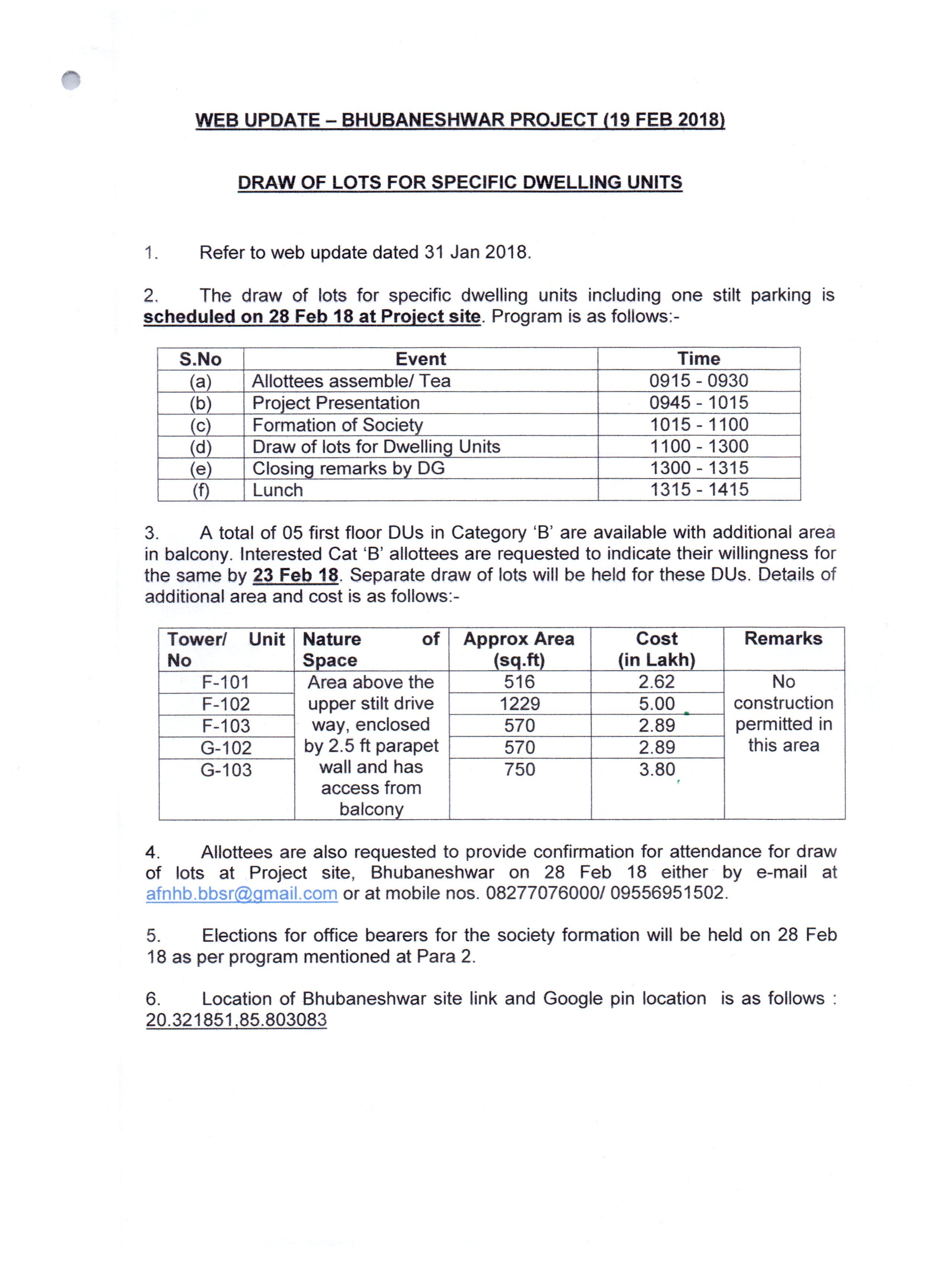 Bhubaneshwar: Draw of Lots for specific Dwelling Unit on 28 Feb 18 at Project Site.(19 Feb 18) [View Details]
