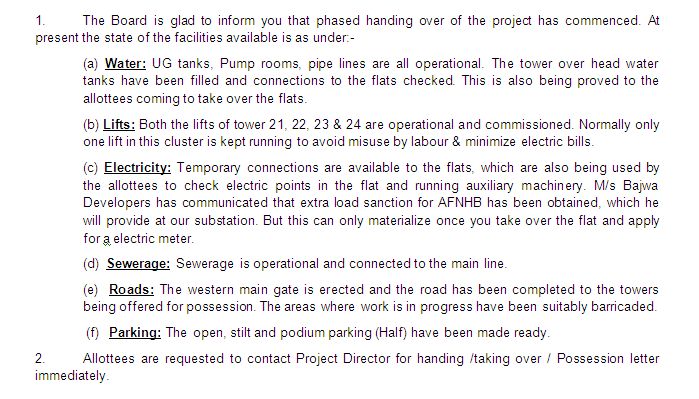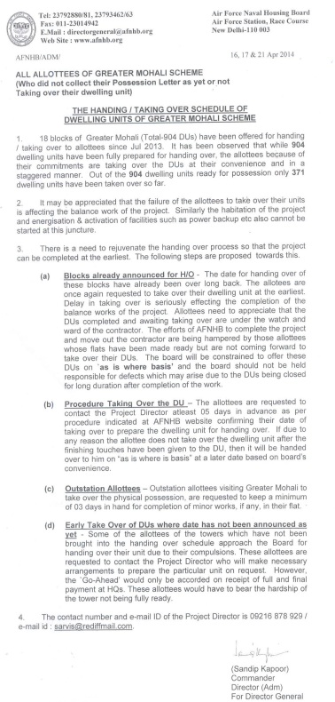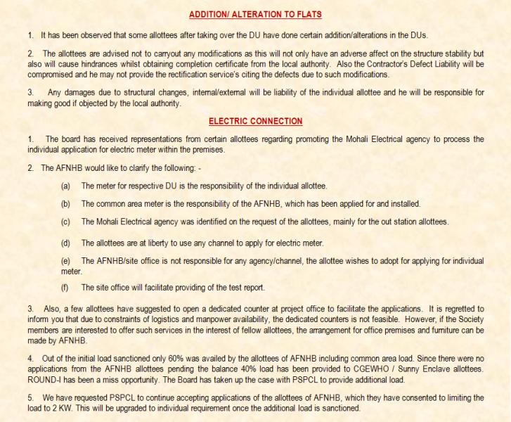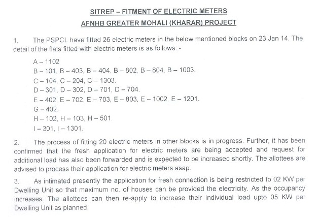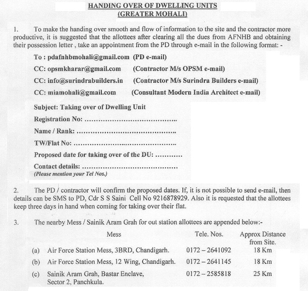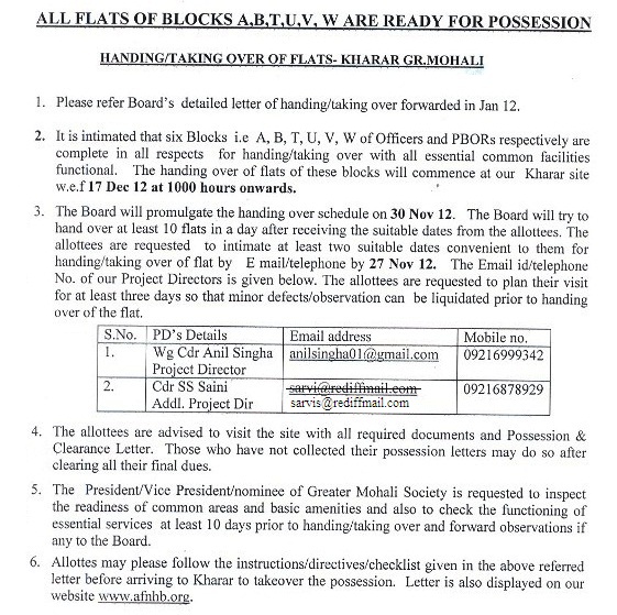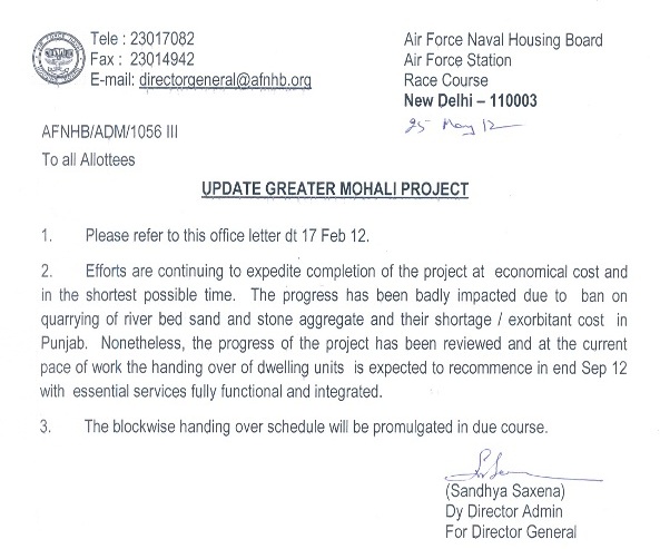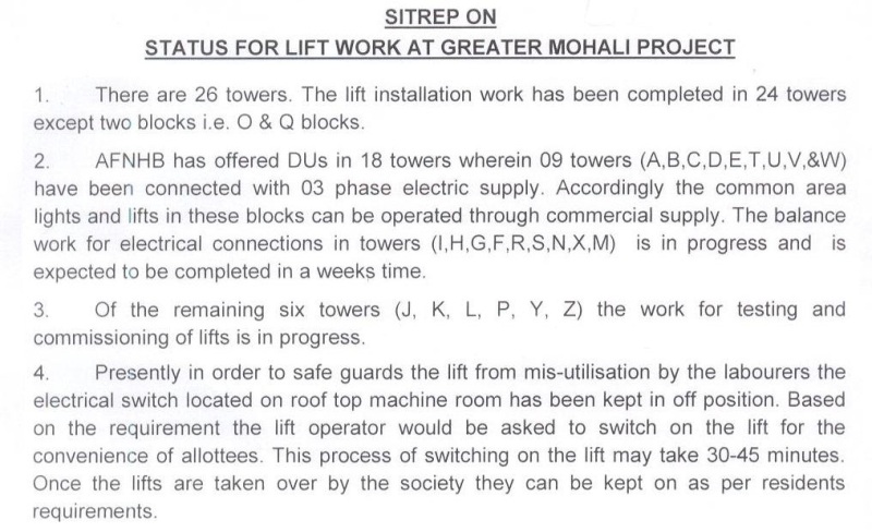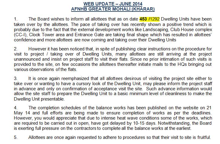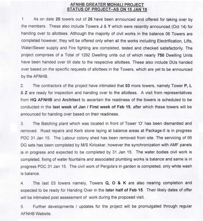 1. Consequent to the visit of DG, AFNHB and Principal Director (Wks) to the project on 01 & 02 Feb 14, a technical audit with the members from AFNHB, Project Staff, Contractor and tile manufacture was carried out from 04 Feb 14 to 16 Feb 14. The aim of the audit was to ascertain the requirement and identify the flats which have shade variation on the floor tiles. The team visited each and every flat except those found locked (Handed Over) in the 18 towers which have been offered to the allottees for taking over. 2. The comprehensive audit report has then been compiled and the total quantity of tile requirement ascertained. The required quantity has been intimated to the tile manufacturer i.e. M/s. Somany Tiles. 3. M/s. Somany has been instructed to carry out a thorough check of all its stocks which were supplied with similar shades, during the corresponding period when the tiles were supplied to Mohali project. Although few boxes have been located at Ahmadabad, these are very less compared to our requirement. M/s. Somany has sought one weeks� time i.e. upto 04 Mar 14 to carryout full search on all over India basis with their stockiest to locate similar shade tiles if available. Based on the total tiles located, these would then be brought to the Mohali Project and replacement in those flats where shade variations exists will be under taken. At the same time allottees are at liberty to locate matching tiles from the market (including other manufactures) and the tiles will be replaced. 4. Next update would be posted after 07 Mar 14 to appraise the status.