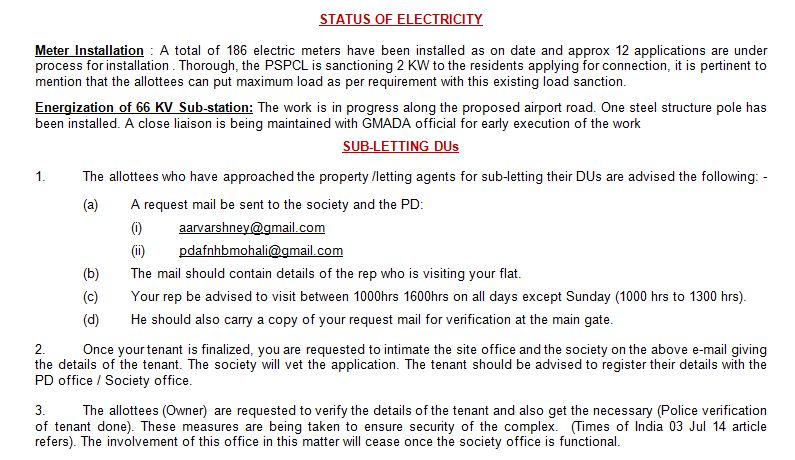 NOTICE: FROM PRESIDENT GREATER MOHALI SOCIETY 1. GBM of JVTY Greater Mohali Apartment Owner’s Association will be held on 18 Oct 2014 at Community Centre-I at the project Site. 2. All allottees are requested to contact, Society for further details. The e-mail address of the society is presidentjvtymohali@gmail.com.
