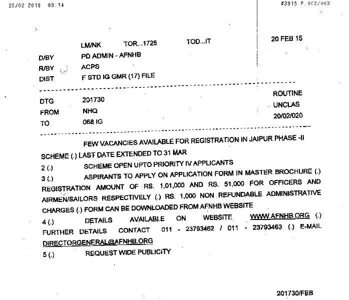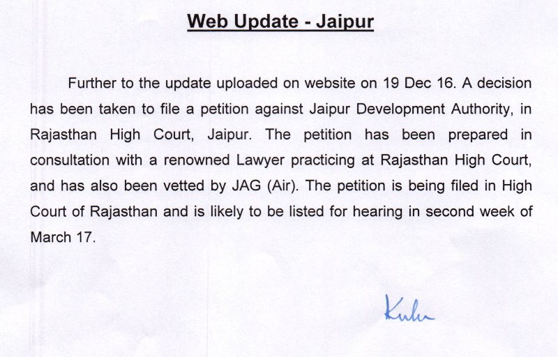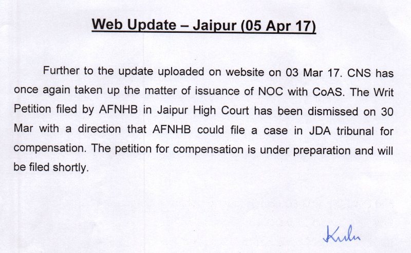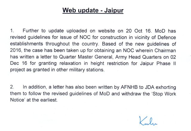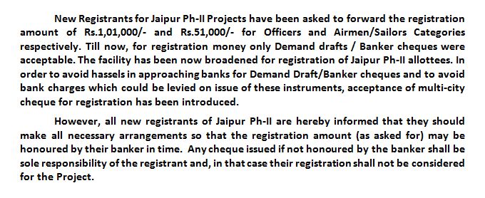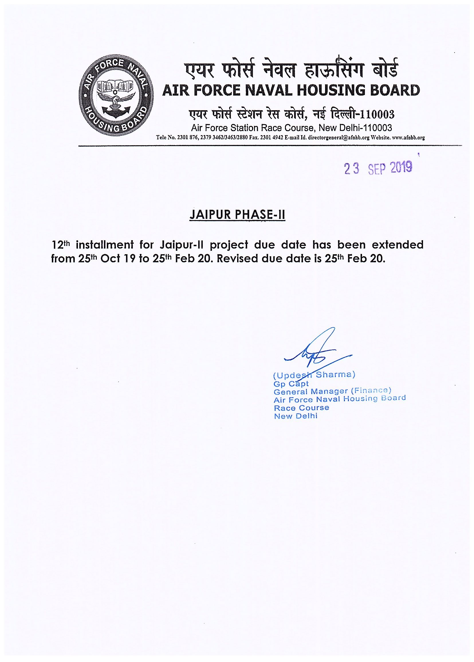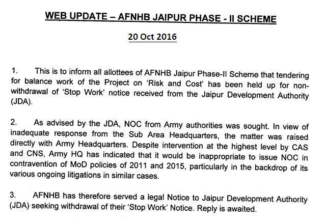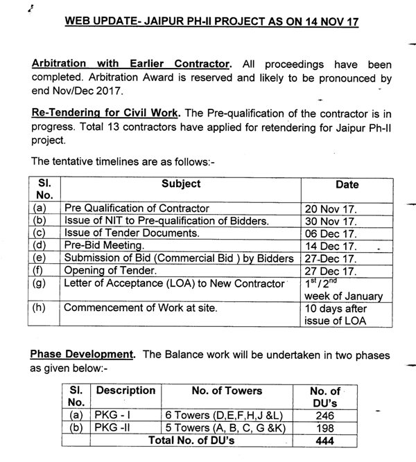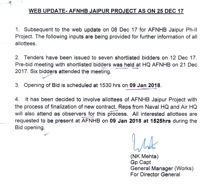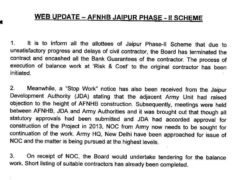 ADVERTISMENT FOR PRE QUALIFICATION OF CONTRACTORS AFNHB JAIPUR PHASE � II PROJECT 1. Reference Web update dated 06 Jan 16 on the above subject. 2. In view of requests received from few firms, the date of submission of duly completed PQs is extended to 15 Feb 16. 3. All concerned to note. Pre Qualification of Contractors (Jaipur) (Date of submission Extended to 15 Feb 16) WEB UPDATE AS ON 27 JAN 16 : 1. It is to inform all the allottees of Jaipur Phase-II Scheme that due to unsatisfactory progress and delays of civil contractor, the Board has terminated the contract and encashed all the Bank Guarantees held as securities of the contractor. 2. The process of execution of balance work at �Risk & Cost� to the original contractor has been initiated and procedure for selection of new contractor commenced. The Board aims to award the execution of balance work to new contractor within next two to three months and we are hopeful that the balance work would be completed within acceptable timelines. 3. Further update on progress would be informed in first week of Mar 16. Update as on 25 Jan 2016 and List of Members not returned Old Allotment Letter [Read More] Pre Qualification of Contractors (Jaipur) Update as on 9 Jun 2015 [Read More] Update as on 9 Jul 15