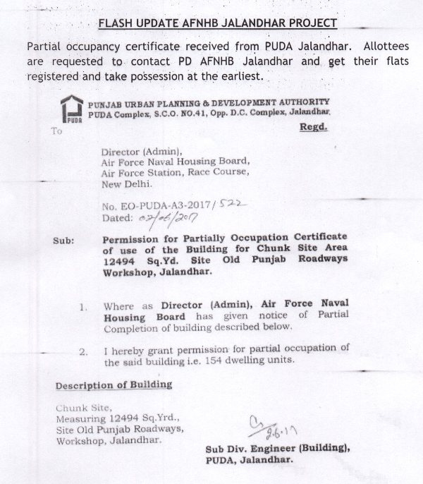 Partial occupancy certificate from PUDA, Jalandhar dt. 2 Jun 17. [View Details...]