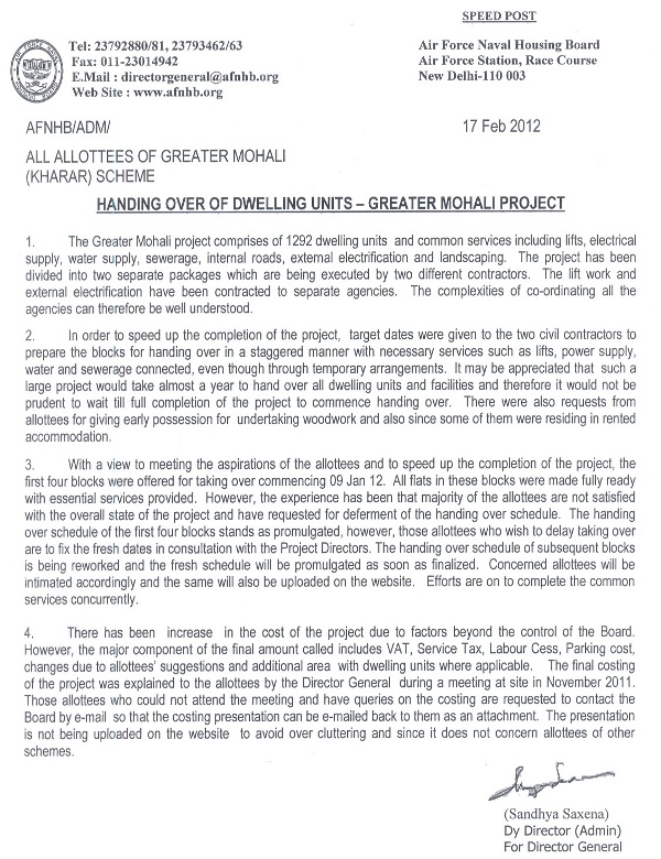 Handing over of dwelling Units : Letter dated 17 Feb 12.