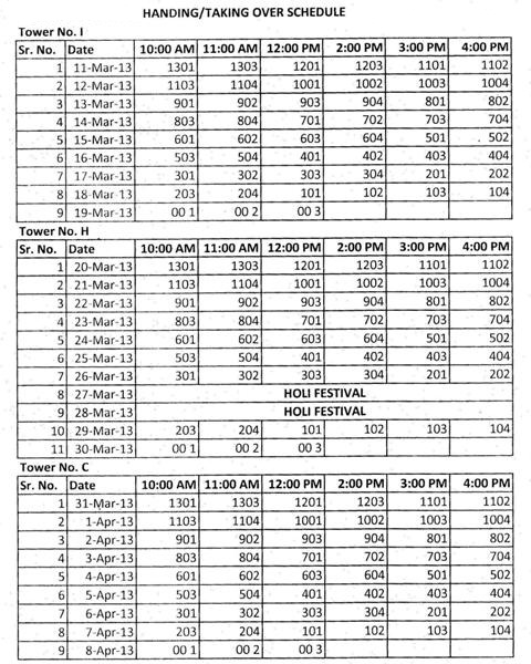 Greater Mohali (Kharar) : Handing/Taking over schedule for I, H, C, R and S Block