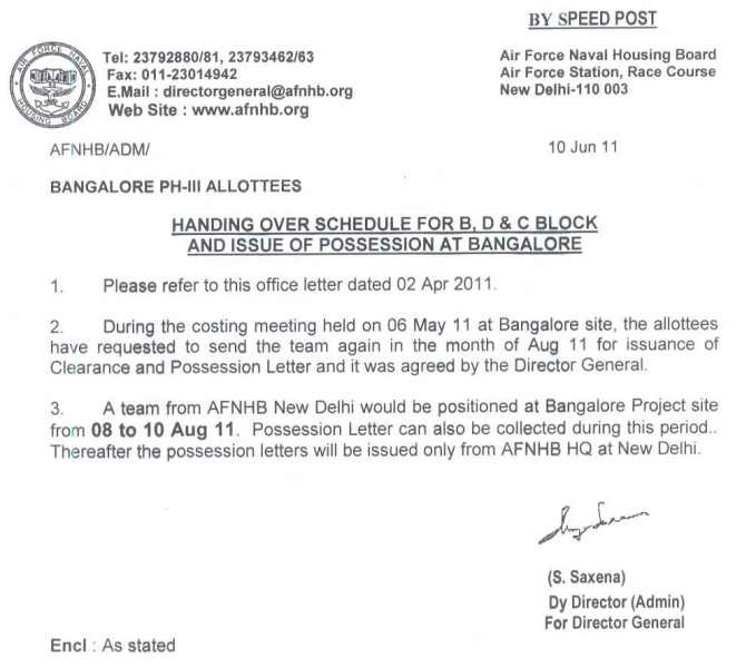 ISSUE OF POSSESSION LETTER : BANGALORE PH-III SCHEME
