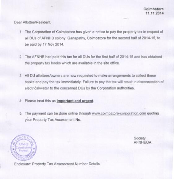 1. A notice from Coimbatore Corporation has been received for payment of property Tax for Fy 2014-15 (2nd half) .The last date of payment is 17 Nov 14.