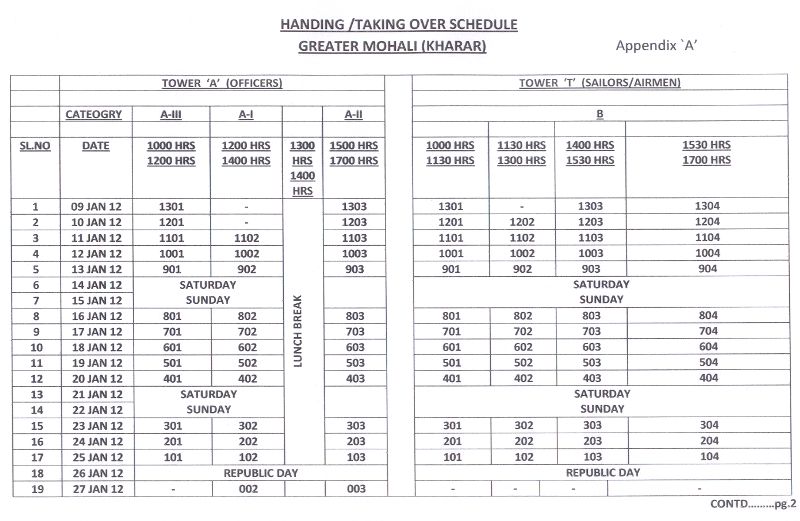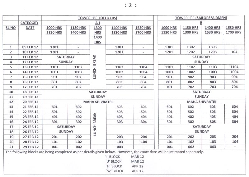 Handing over Schedule for Block - A From 09 Jan 12 Block - T From 09 Jan 12 Block - B From 09 Feb 12 Block - R From 09 Feb 12 and Block - I and U From Mar 12 Block - H and W From Apr 12 Schedule of handing over of other Blocks will be announced later. |