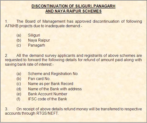 AFNHB generally constructs two categories of dwelling units, one for the officers category and the other for airmen / sailors category of Air Force and Navy. The funding for the dwelling units is through Self Financed Schemes with an approximate of 10% of the expected price of the flat being deposited at the time of registration and balance in easy installments.