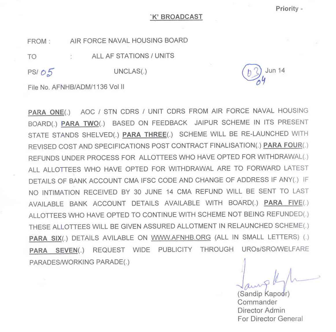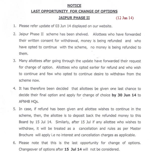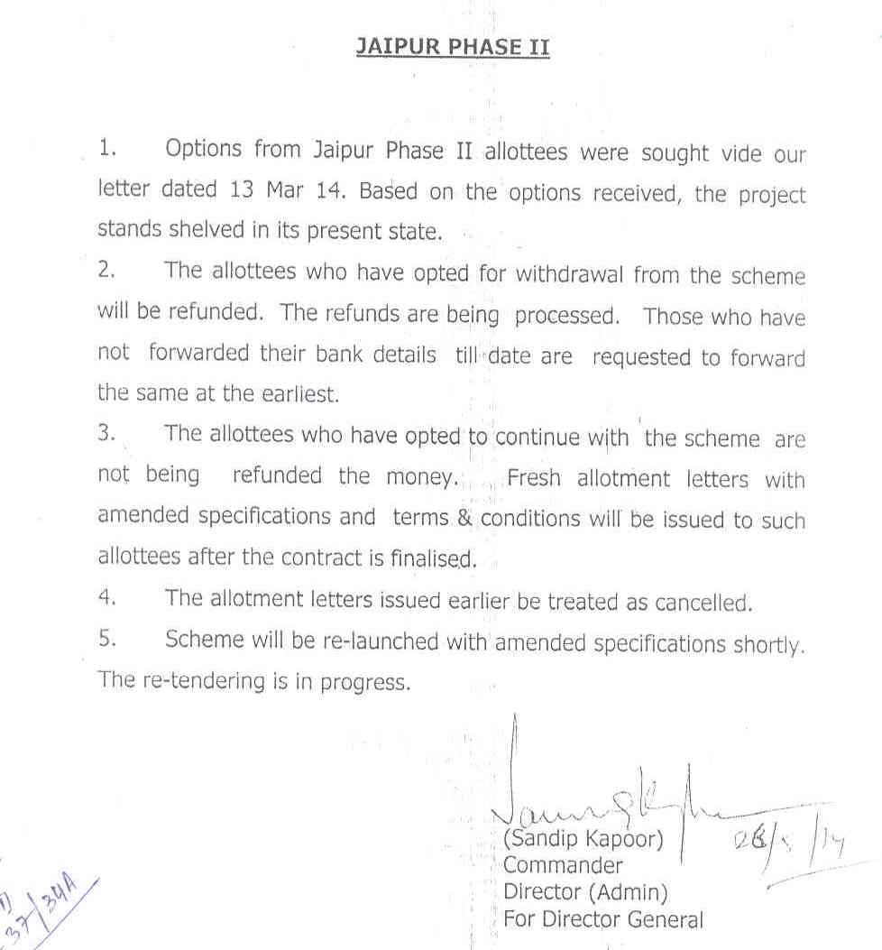 2. The allottees who have opted for withdrawal from the scheme will be refunded. The refunds are being processed. Those who have not forwarded their bank details till date are requested to forward the same at the earliest. 3. The allottees who have opted to continue with the scheme are not be refunded the money. Fresh allotment letters with amended specifications and terms and conditions will be issued to such allottees after the contract is finalised. 4. The allotment letters issued earlier be treated as cancelled. 5. Scheme will be re-launched with amended specifications shortly. The re-tendering is in progress. |